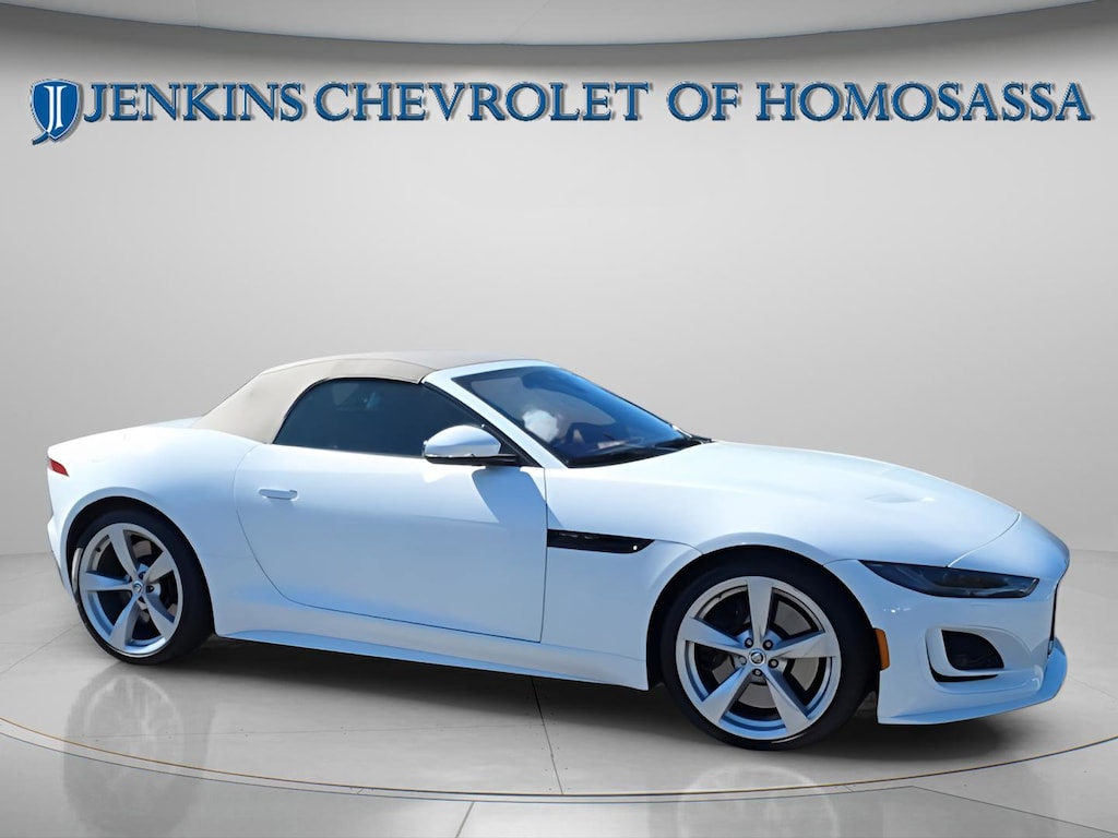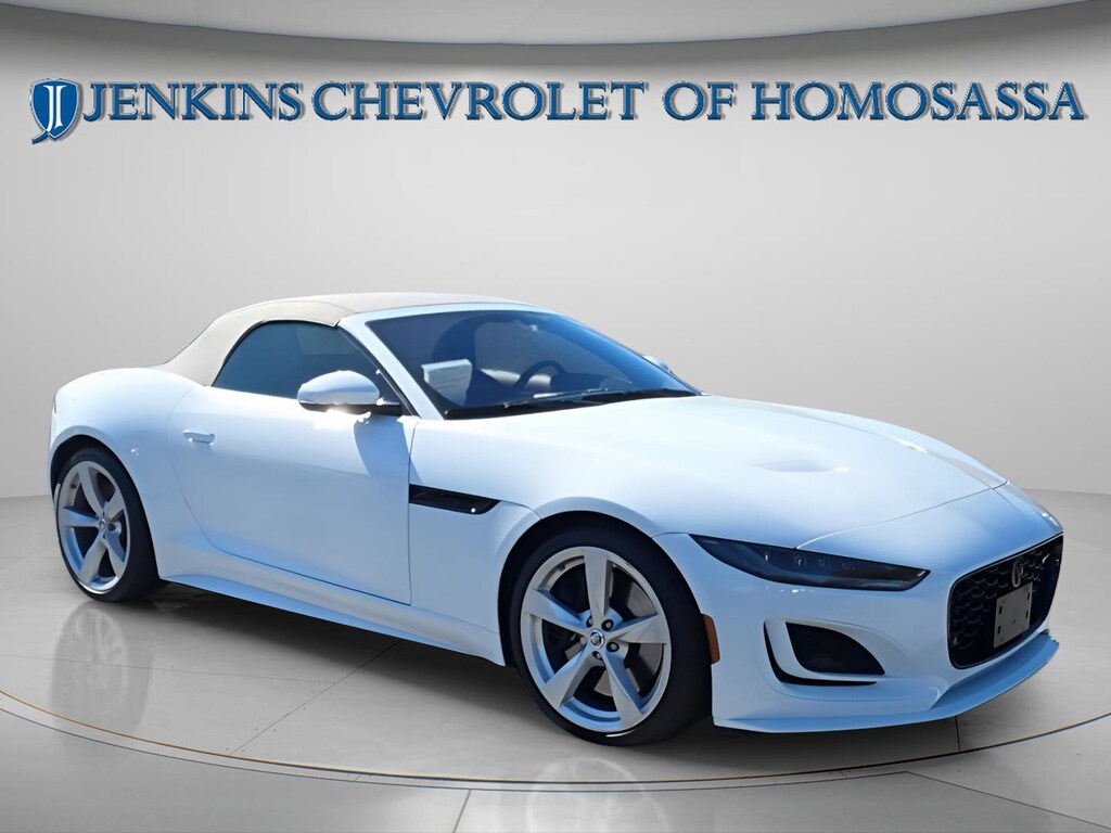 This vehicle comes equipped with 10 Speakers, 4-Wheel Disc Brakes, ABS brakes, Adaptive suspension, Air Conditioning, Alloy wheels, AM/FM radio: SiriusXM, Apple CarPlay/Android Auto, Auto High-beam Headlights, Auto tilt-away steering wheel, Auto-dimming door mirrors, Auto-dimming Rear-View mirror, Automatic temperature control, Brake assist, Bumpers: body-color, Convertible roof lining, Delay-off headlights, Driver door bin, Driver vanity mirror, Dual front impact airbags, Dual front side impact airbags, Electronic Stability Control, Emergency communication system: Remote SOS Emergency Call, Exterior Parking Camera Rear, Four wheel independent suspension, Front anti-roll bar, Front Bucket Seats, Front Center Armrest, Front dual zone A/C, Front reading lights, Fully automatic headlights, Garage door transmitter: HomeLink, Glass rear window, Grained Leather & Suedecloth Seating Surfaces, Heated door mirrors, Heated front seats, Heated steering wheel, Illuminated entry, Integrated roll-over protection, Leather Shift Knob, Low tire pressure warning, Memory seat, Navigation System, Occupant sensing airbag, Outside temperature display, Overhead console, Panic alarm, Passenger door bin, Passenger vanity mirror, Power convertible roof, Power door mirrors, Power driver seat, Power passenger seat, Power steering, Power windows, Radio data system, Radio: Meridian 380W Audio System, Rain sensing wipers, Rear anti-roll bar, Rear fog lights, Rear window defroster, Remote keyless entry, Security system, Speed control, Speed-sensing steering, Spoiler, Sport 12-Way Electric & Heated Front Seats, Steering wheel memory, Steering wheel mounted audio controls, Tachometer, Telescoping steering wheel, Tilt steering wheel, Traction control, Trip computer, Turn signal indicator mirrors, Variably intermittent wipers, and Wheels: 20" Style 5060 5 Spoke Gloss Sparkle Silver . Jenkins Chevrolet of Homosassa proudly serving Homosassa, Spring Hill, Hernando, Crystal River, Beverly Hills, Inverness. Just a half hour North of Buccaneer Bay. Come see the large, expansive inventory of the Jenkins Auto Group. 17/24 City/Highway MPG Clean CARFAX. CARFAX One-Owner. Fuji White 2024 Jaguar F-TYPE P450 RWD 8-Speed Automatic 5.0L V8 Supercharged